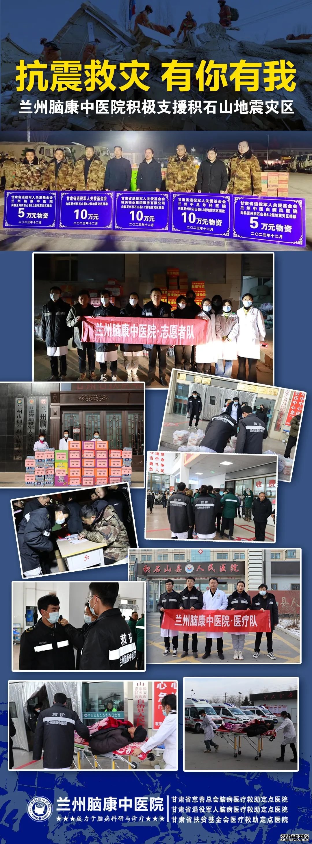 兰州脑康中医院作为专科医疗机构,得知这个消息时,我院李院长立刻安排抗震救灾医疗助力工作,并积极动员医院的医生、护士们纷纷加入到这场援助行动中。